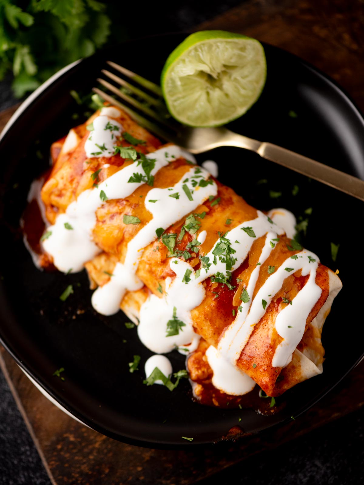These beef burritos are smothered in enchilada sauce and melted cheese, so they’re best served with a fork and knife rather than eaten by hand.
