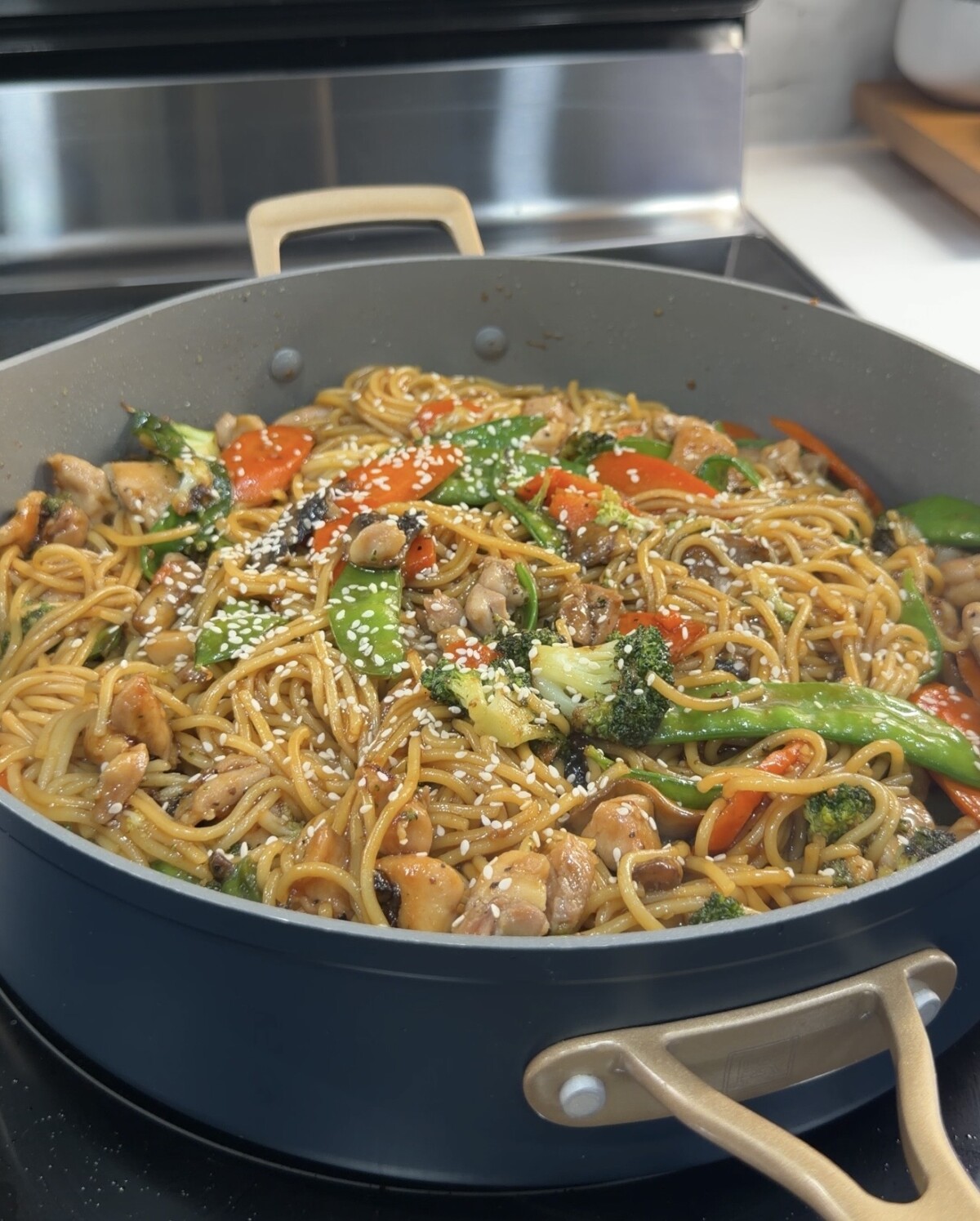 Freezing isn’t recommended for this dish. The noodles and vegetables can become soft and watery once thawed, which affects both texture and sauce consistency.